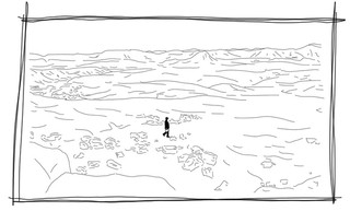 6 frame storyboard illustrations from the opening of Paris, Texas (1984) by Wim Wenders